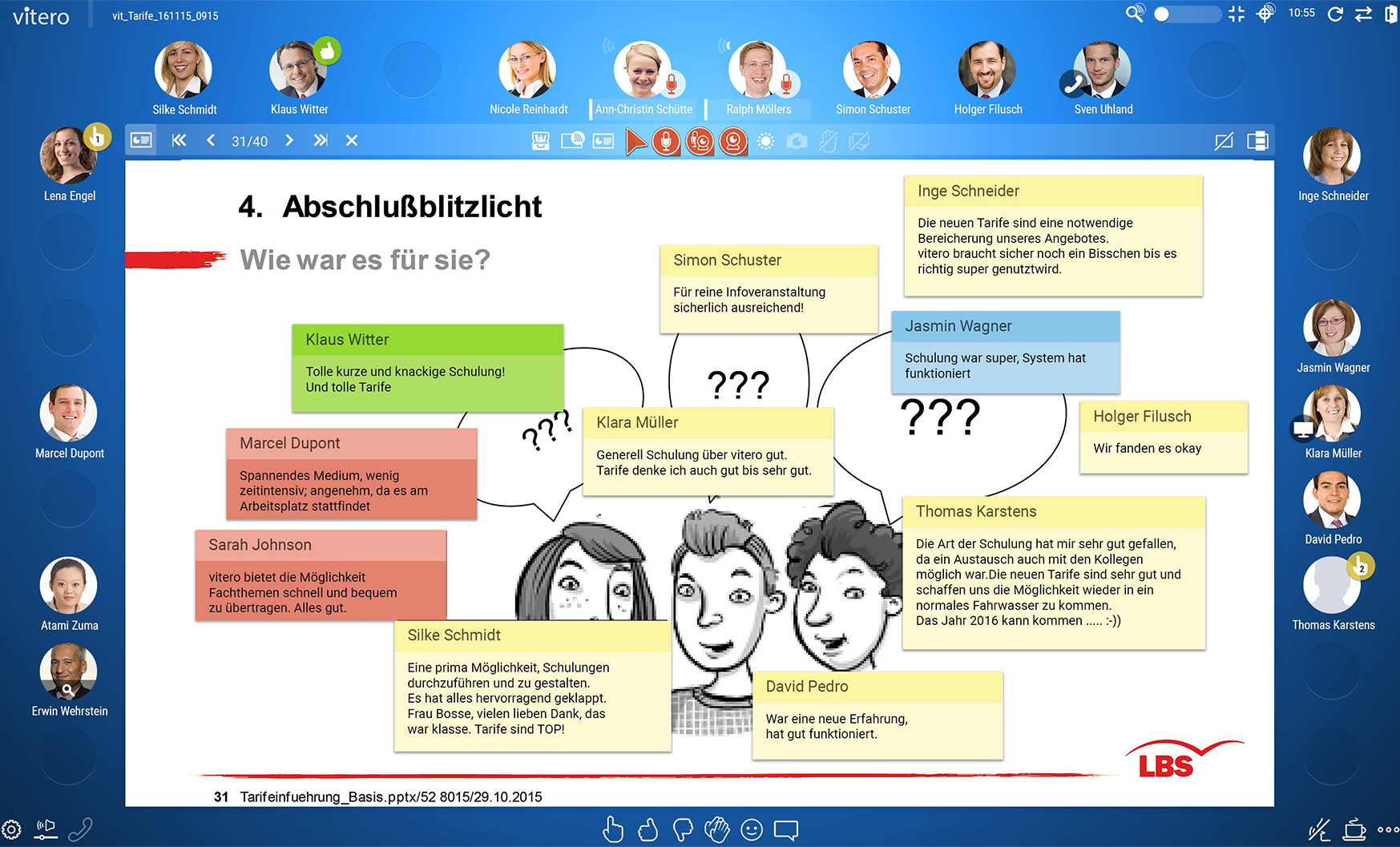„Mit den Werkzeugen und Funktionen von vitero konnten wir unseren Teilnehmern die Ähnlichkeit zu Präsenzveranstaltungen nach kurzer Umgewöhnung schnell deutlich machen“, sagt Herr Möllers. Auch das trug zum Erfolg der Veranstaltungen bei. „Das Seminar fängt an zu leben. Und es entsteht eine Atmosphäre wie in einer Präsenzveranstaltung. Wir können miteinander Sachen erarbeiten.“ Der positive Nebeneffekt: Die LBS hat geschickt das Nützliche mit dem Angenehmen verbunden. Tarifschulung und erste Erfahrung im Umgang mit vitero für die Mitarbeiter, denen später auch das neue EDV-System mit dem Tool nähergebracht werden soll.