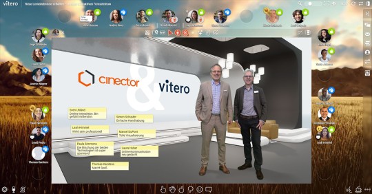 Mit dem gemeinsamen Ziel, der Online-Müdigkeit entgegenzuwirken, arbeiten wir seit Mai 2023 mit unserem neuen Kooperationspartner, der Cinector GmbH, zusammen. Die vielfältigen Kollaborationsmöglichkeiten von vitero inspire können im virtuellen Studio von Cinector STAGE, in live gestreamten Corporate Meetings, Webinaren und Trainings perfekt eingesetzt werden. Die Qualität und Effektivität von Online-Schulungen wird somit weiter gesteigert.